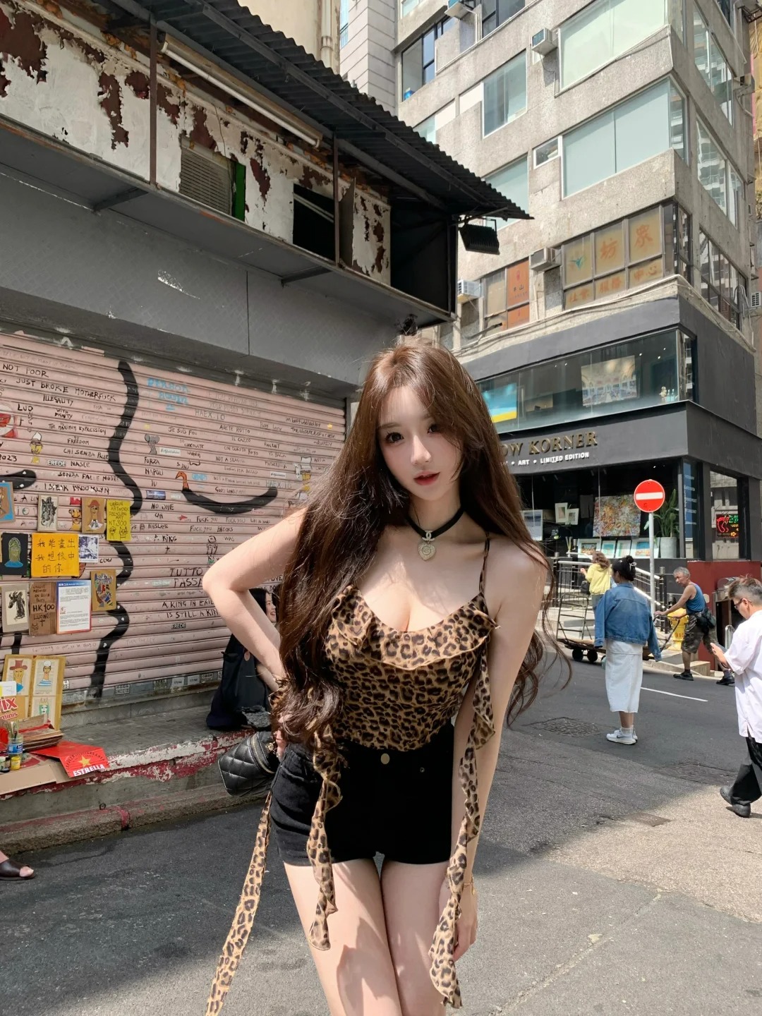 今天是一个阳光明媚的日子,天气暖洋洋的,让人忍不住想要出去走走。我选择了一件豹纹吊带搭配黑色高腰短裤,再系上一条简约的黑色项链,显得既个性又性感。在城市的某个街角,我发现了一片独特的区域:破旧的铁皮墙上满是涂鸦和贴纸,带着复古与艺术交织的气息。我站在墙前拍了一张照片,阳光洒在肩膀上,仿佛将我与这片街头艺术融为一体。这里的气息,让人感到放松又自由,像是一个记录故事的地方。