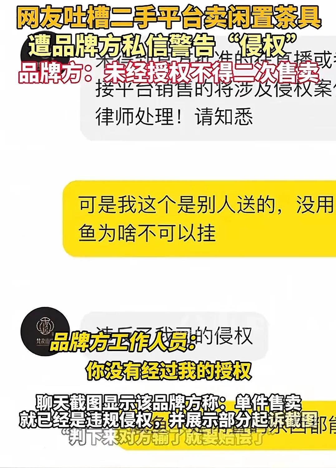 今日、一位网友感觉自己的茶具不经常用、就打算把他放到二手平台上售卖、但没想到却发生了一件让人感到奇葩的事情、仅仅是在二手平台出售闲置的茶具,竟然招惹到这个茶具品牌方的私信、警告他侵权,