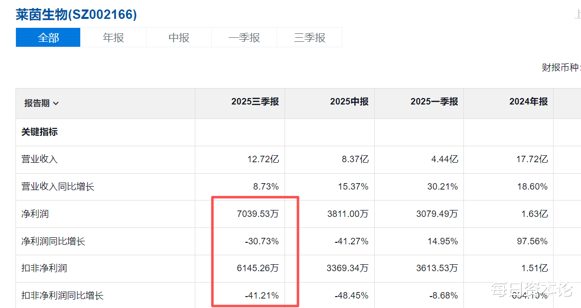 在叙事光环褪色、创始人信用破产的同时,莱茵生物自身的经营也呈现出一种矛盾的疲态。从表面看,公司营收规模持续增长,2025年前三季度营收为12.72亿元,同比增长8.73%,但净利润仅7039.53万元,同比下跌30.73%,陷入“增收不增利”的窘境。