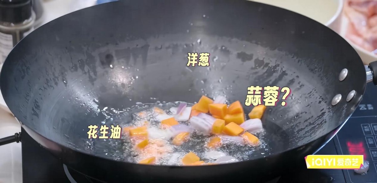 食材准备完了开始下锅,先下花生油再下洋葱和蒜蓉,结果他忘了蒜在哪里,把胡萝卜倒进去了。