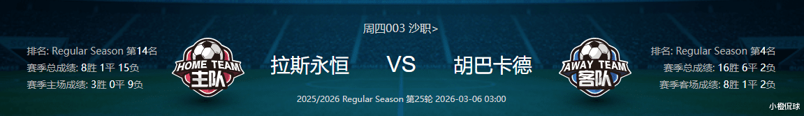 看法:两队历史交锋完全呈一边倒,胡巴卡德近8次对阵拉斯永恒拿下6胜1平1负,堪称对手克星,心理优势巨大。拉斯永恒虽上轮联赛客场取胜,进攻端火力强劲,但主场表现糟糕,近10个主场仅1胜9负,防守问题严重,场均失球2.2个。反观胡巴卡德上轮联赛战平,但近15轮联赛11胜4平保持不败状态极佳,其客场作战能力出众,攻防两端卡达西亚也优势明显。综合来看个人认为胡巴卡德客场取胜概率较大。