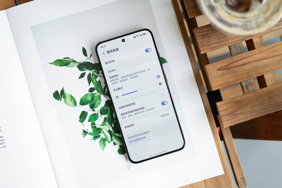 同时风扇是支持手动调节和智能调节的,最高25000转/分钟,在把它拉到最大的时候,可以明显感受到机身后背有风直吹出来。靠近听也自然是会听到声音的。不过实际在打游戏的时候,比如我打王者,拿在面前30cm左右距离,音量在一半左右,基本也就听不到风扇的声音了。自然不会感觉到风扇的“吵”,反而握持的时候手指有风吹过,对我这种手汗多的人来说,还能顺带风干一下。