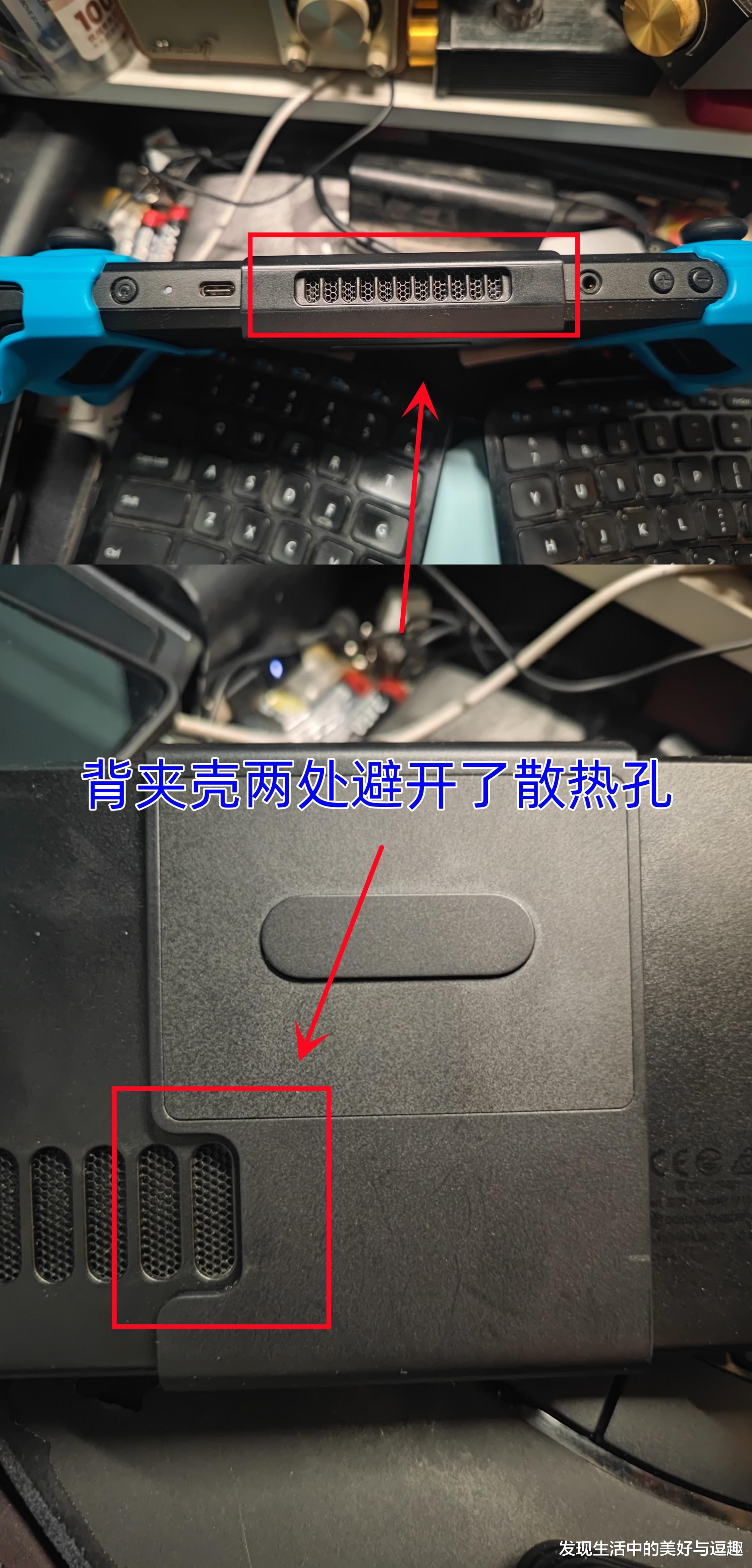 拆掉之前的保护壳,装上背夹壳,壳将主机散热孔都绕过了。然后将电池贴上,磁力强,不容易掉下来。