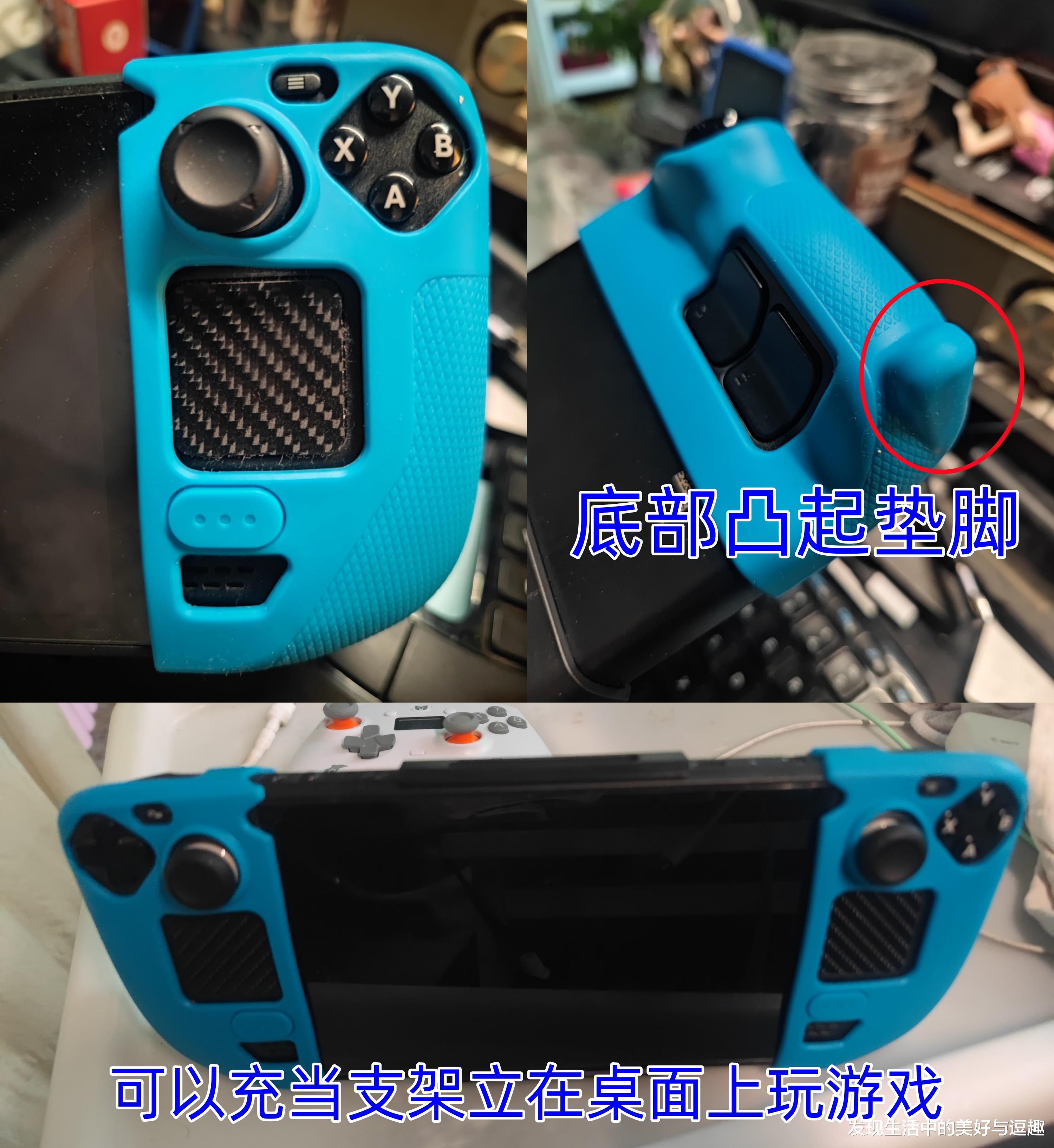 为此,我特意找了找有没有分体式的保护壳,还真的找到了,但发现较晚,黑色和白色都没有货了,只好买了个蓝色的回来。这个分体壳是硅胶的,有个设计比较好,在壳的底部有凸起作为支架使用,可以将掌机立起来使用。