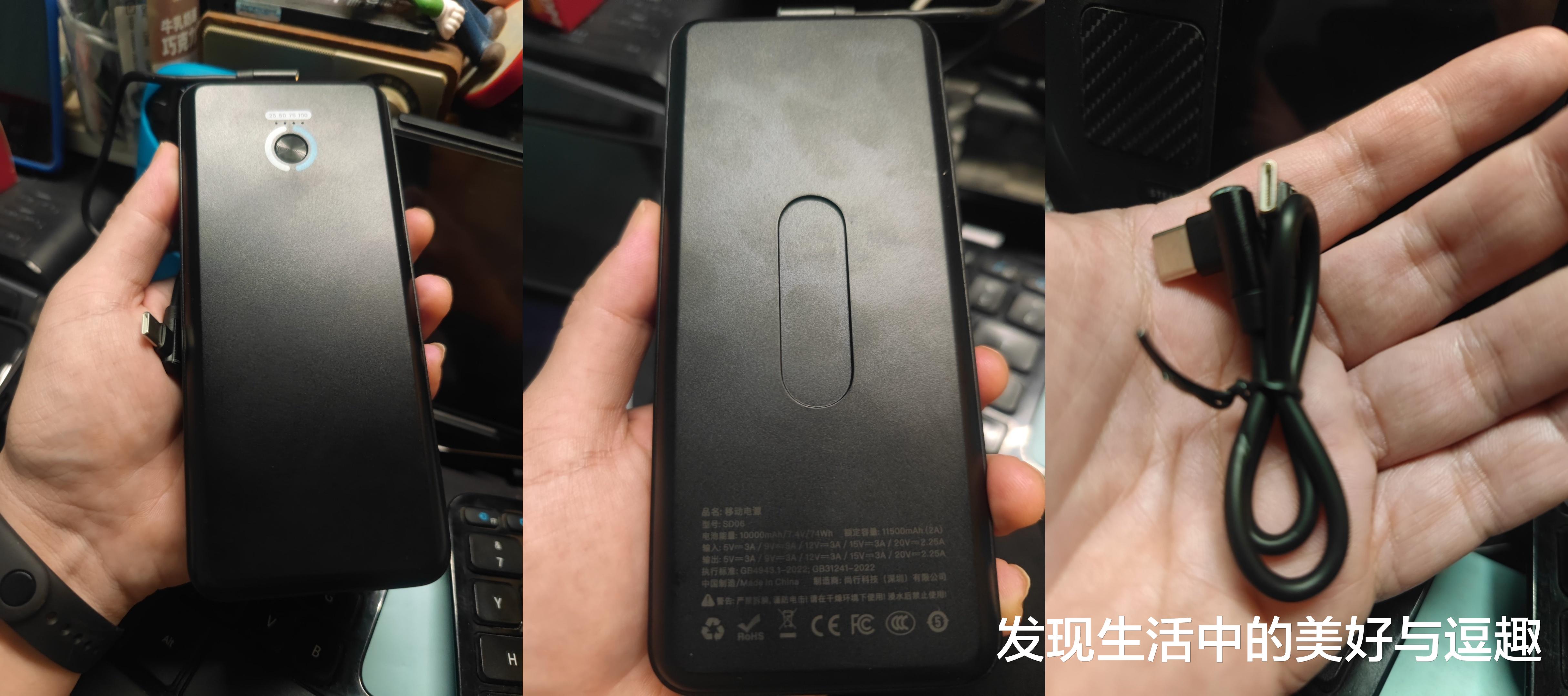 打开包装盒,包含一个充电宝似的电池,一根两头弯头的typec线,一个充电线,一个背夹壳。