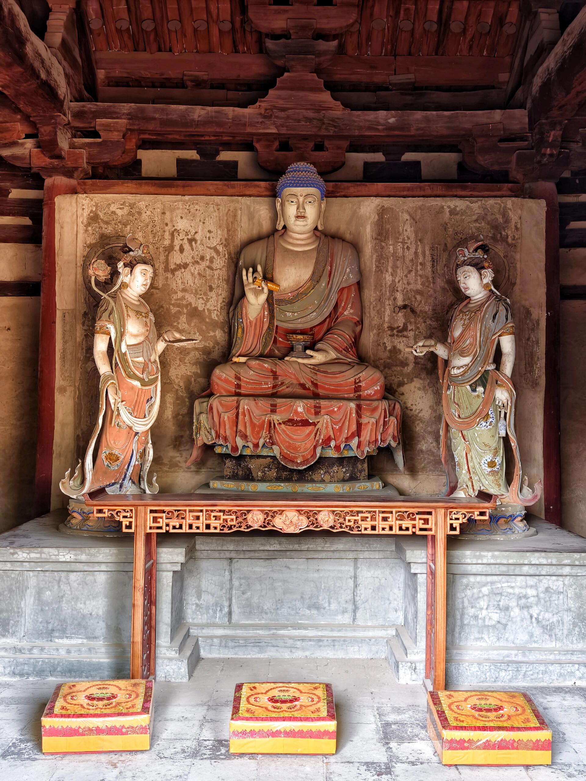 走进大云禅院,首先映入眼帘的是弥陀殿,这座五代时期留存至今的建筑,是整个禅院最耀眼的明珠。站在殿前,仰头望去,斗拱层层叠叠,比例雄大,给人一种庄重而又威严的感觉。与后世建筑不同,五代时期的斗拱不仅是装饰,更是结构的关键所在,它们像巨人的臂膀,稳稳地托举起屋檐,展现出古人卓越的力学智慧。更令人惊叹的是,弥陀殿柱头间那道普柏枋,看似简单的横木,却有着非凡的意义。它是现存古建筑中使用普柏枋的最早实例,这条不起眼的枋木,默默见证了中国古建筑结构演变的重要节点,为后世研究古代建筑的发展提供了珍贵的实物资料。