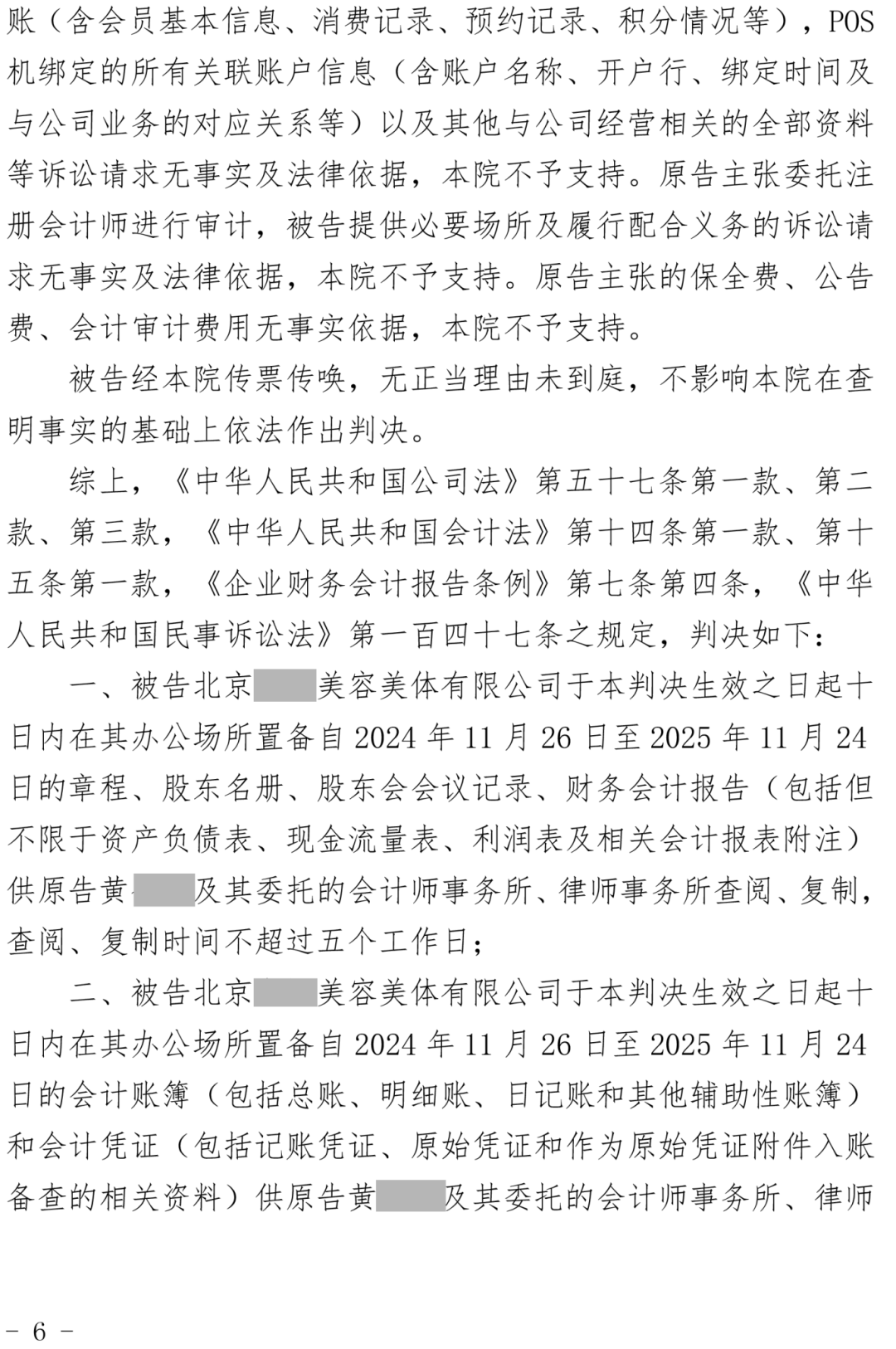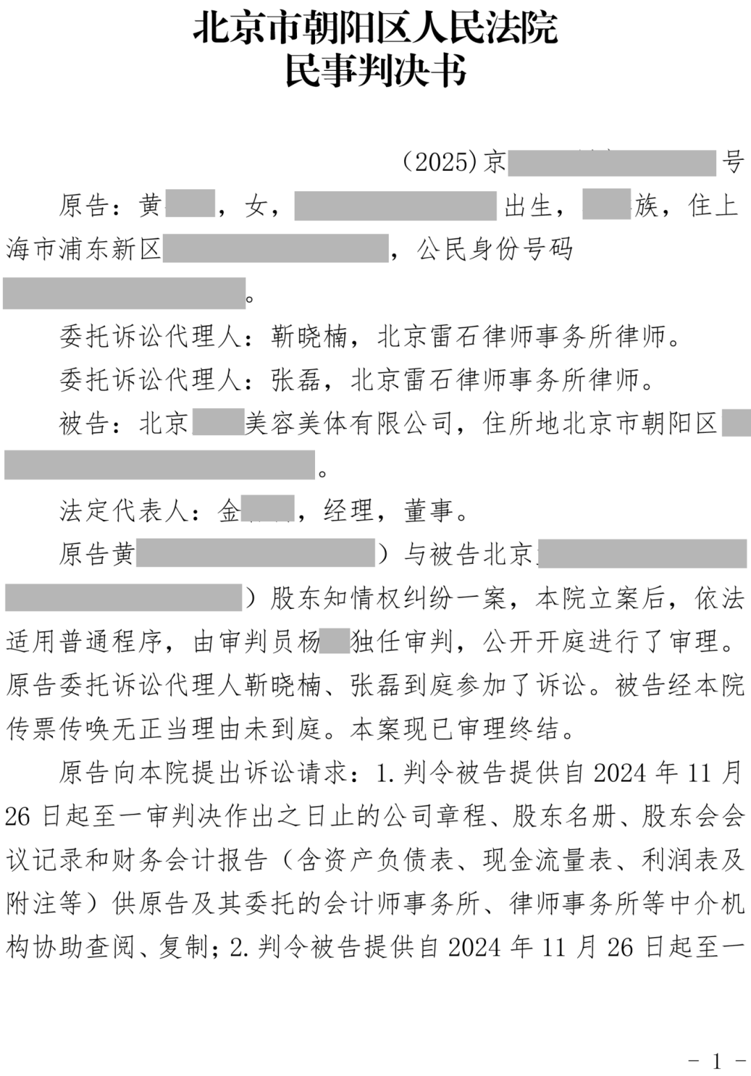 判决结果:核心诉求获法院支持,维权之路终见成效北京市朝阳区人民法院经审理后判决:涉案公司于判决生效之日起十日内,在其办公场所置备自2024年11月26日至2025年11月24日的公司章程、股东名册、股东会会议记录、财务会计报告(含资产负债表、现金流量表、利润表及相关附注),供黄女士及其委托的中介机构查阅、复制,查阅复制时间不超过五个工作日;涉案公司于判决生效之日起十日内,在其办公场所置备上述期间的会计账簿及会计凭证,供黄女士及其委托的中介机构查阅,查阅时间不超过五个工作日;案件受理费由涉案公司负担。法院同时明确,股东查阅会计账簿及会计凭证的权利受法律保护,但复制该类财务资料无法律依据未予支持。