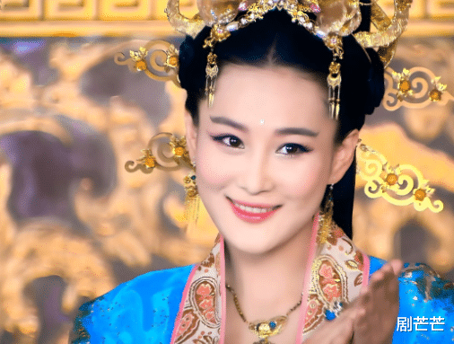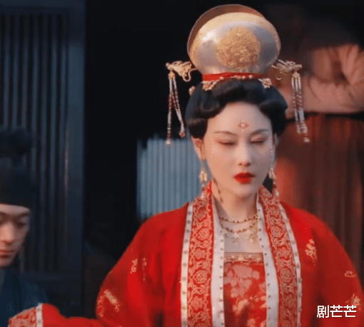 头戴金冠,红衣似火,红唇张扬,脖颈前的珠链,亦是闪闪发光。最难驾驭的配置,穿不好就显得俗,但放在她身上,真的好看,富贵美人,当是如此。