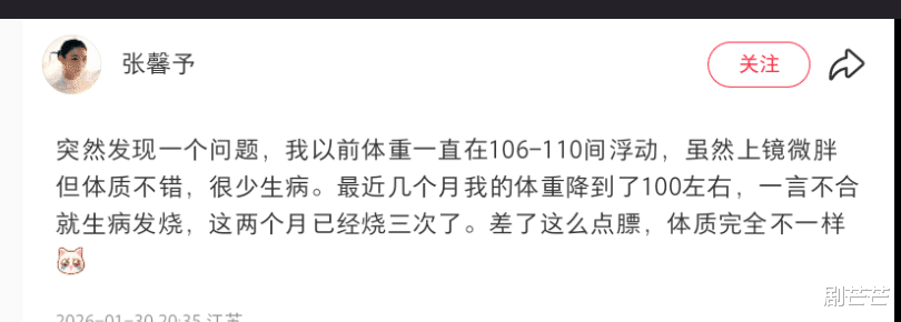 最近,看到张馨予的发文,近两个月内,发烧三次。原因是,以前上镜虽然体质微微显胖,却刚刚好,如今直降八斤左右,完全不一样了。