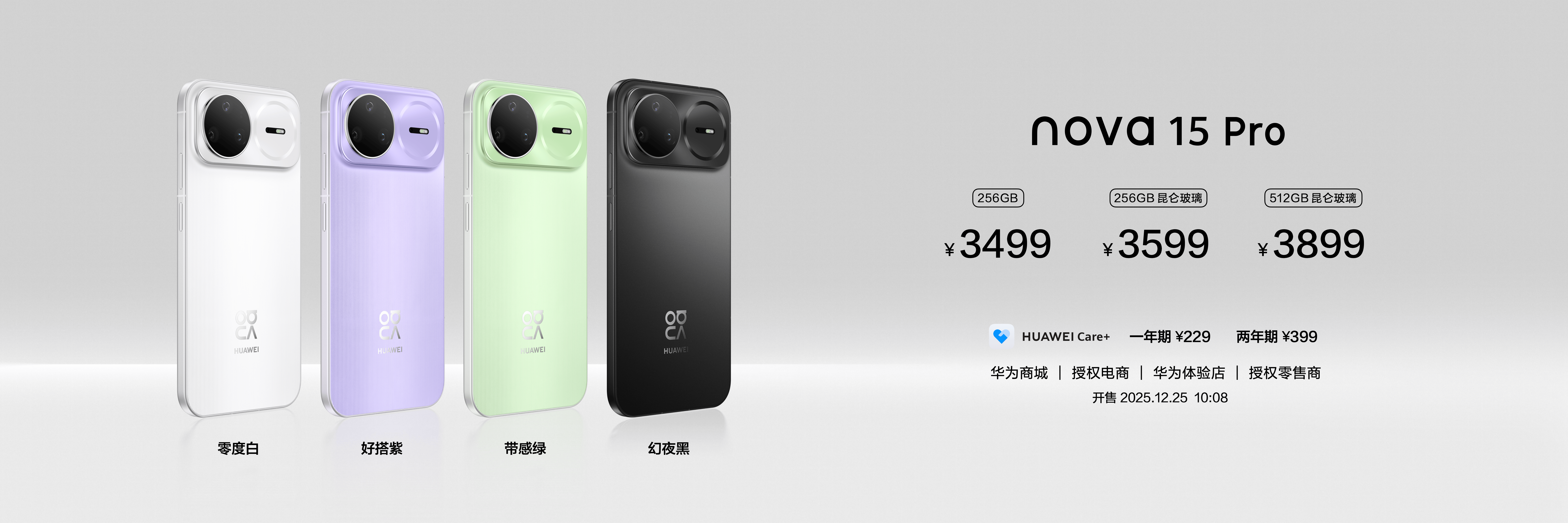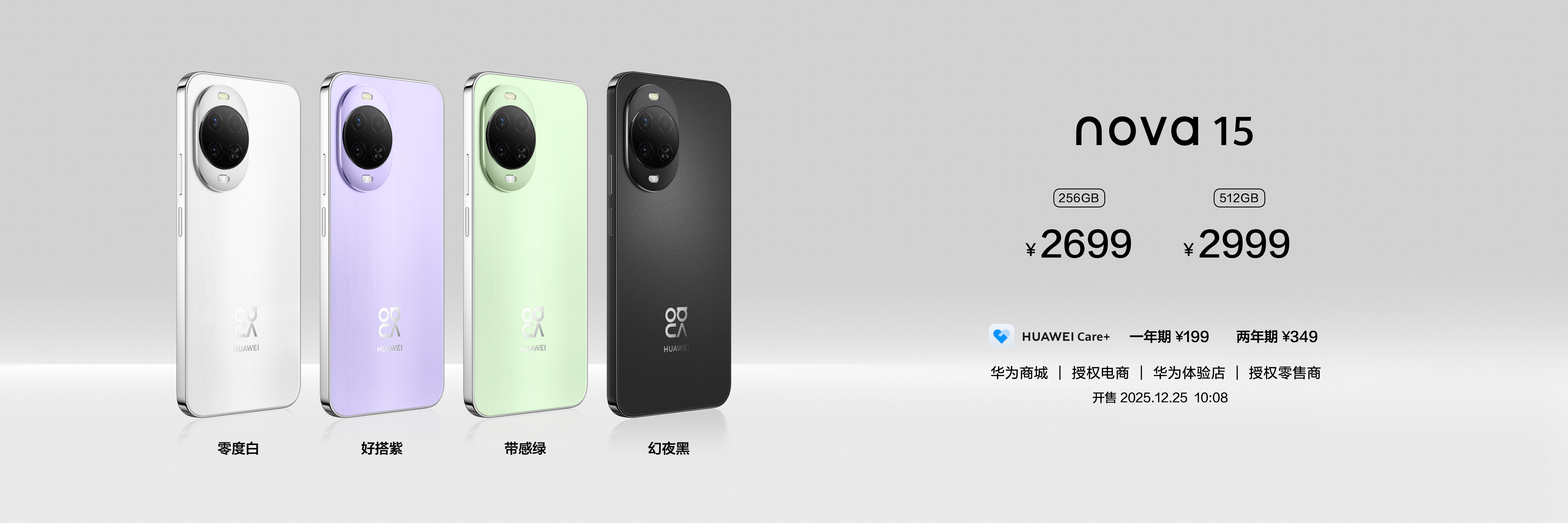nova 15系列将于2025年12月25日10:08正式开售,其中nova 15起售价2699元,nova 15 Pro起售价3499元,nova 15 Ultra起售价4199元。为回馈用户支持,2025年12月25日-2026年1月31日期间,nova 15系列新机用户在华为钱包完成一次签到,即可参与鸿蒙日日新活动,连续30天签到可领取随机金额红包,享受智能生活带来的额外福利。