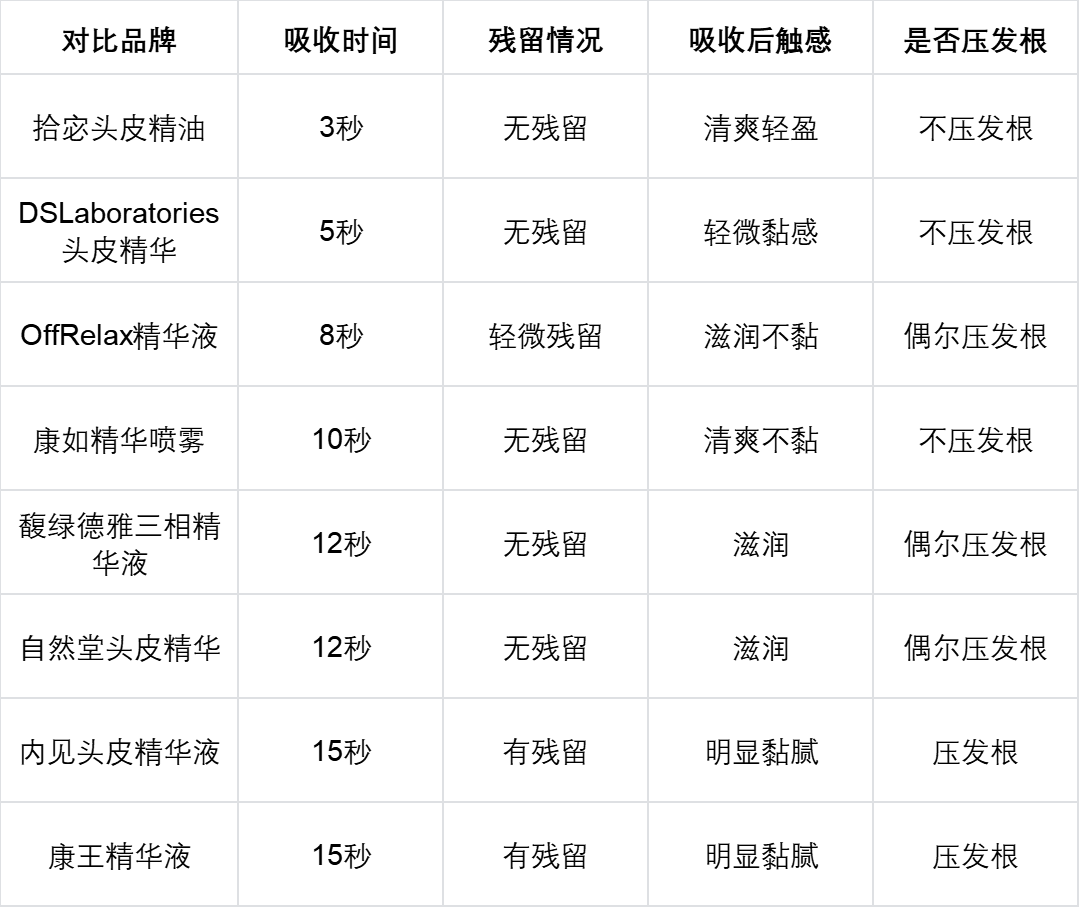 测评方法:每款产品取相同用量,分别涂抹在同侧头皮,用指腹以相同力度按摩,记录完全吸收的时间,观察吸收后头皮的触感,查看是否有残留、是否压发根,判断吸收后的清爽度。