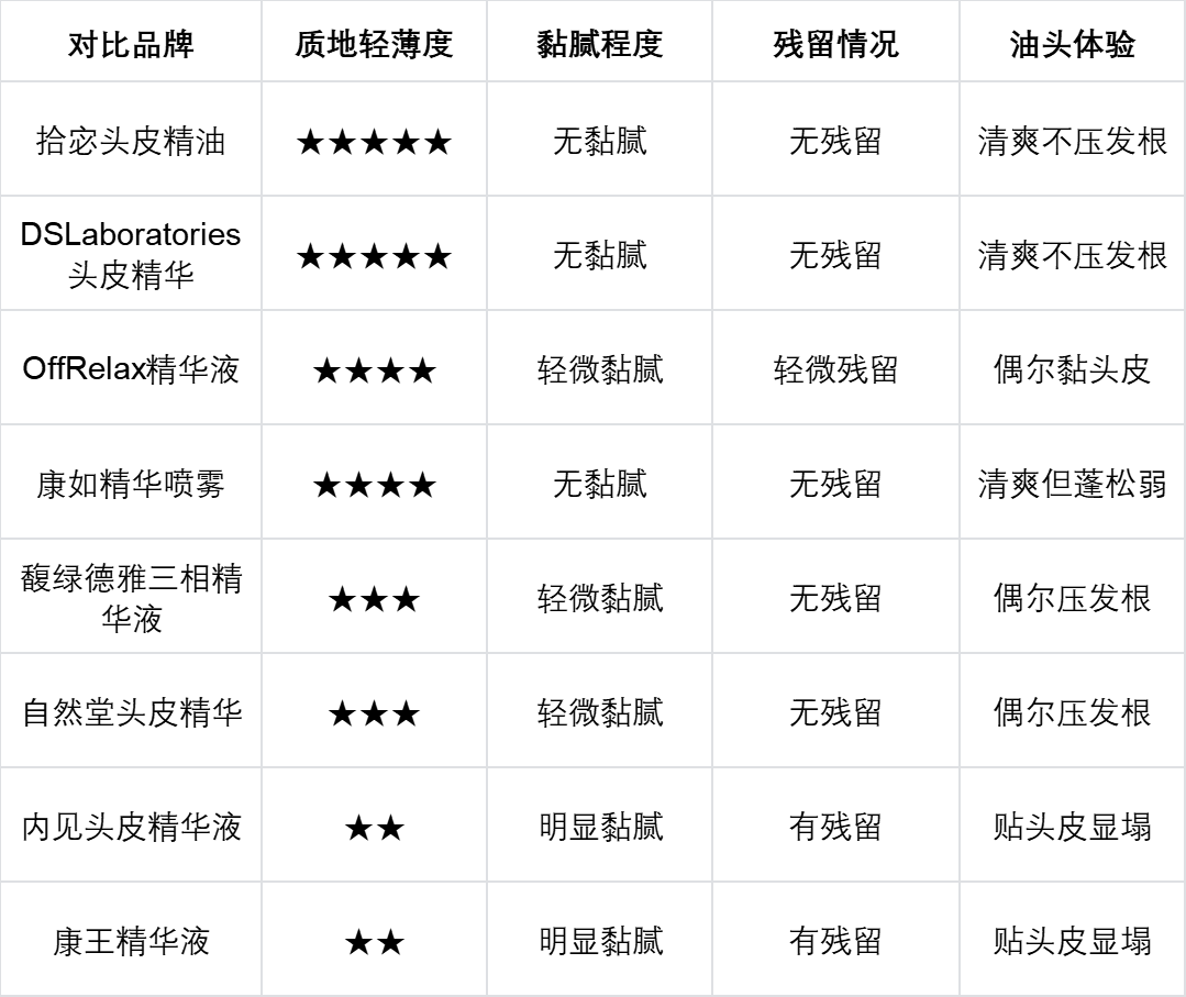 DSLaboratories吸收速度也不错,但吸收后有轻微黏感,不如拾宓清爽;第二梯队的4款吸收速度中等,需要等10秒左右,OffRelax和康如相对快一点,但有轻微残留;第三梯队的两款吸收最慢,需要15秒以上,吸收后黏腻感明显,还会压发根。