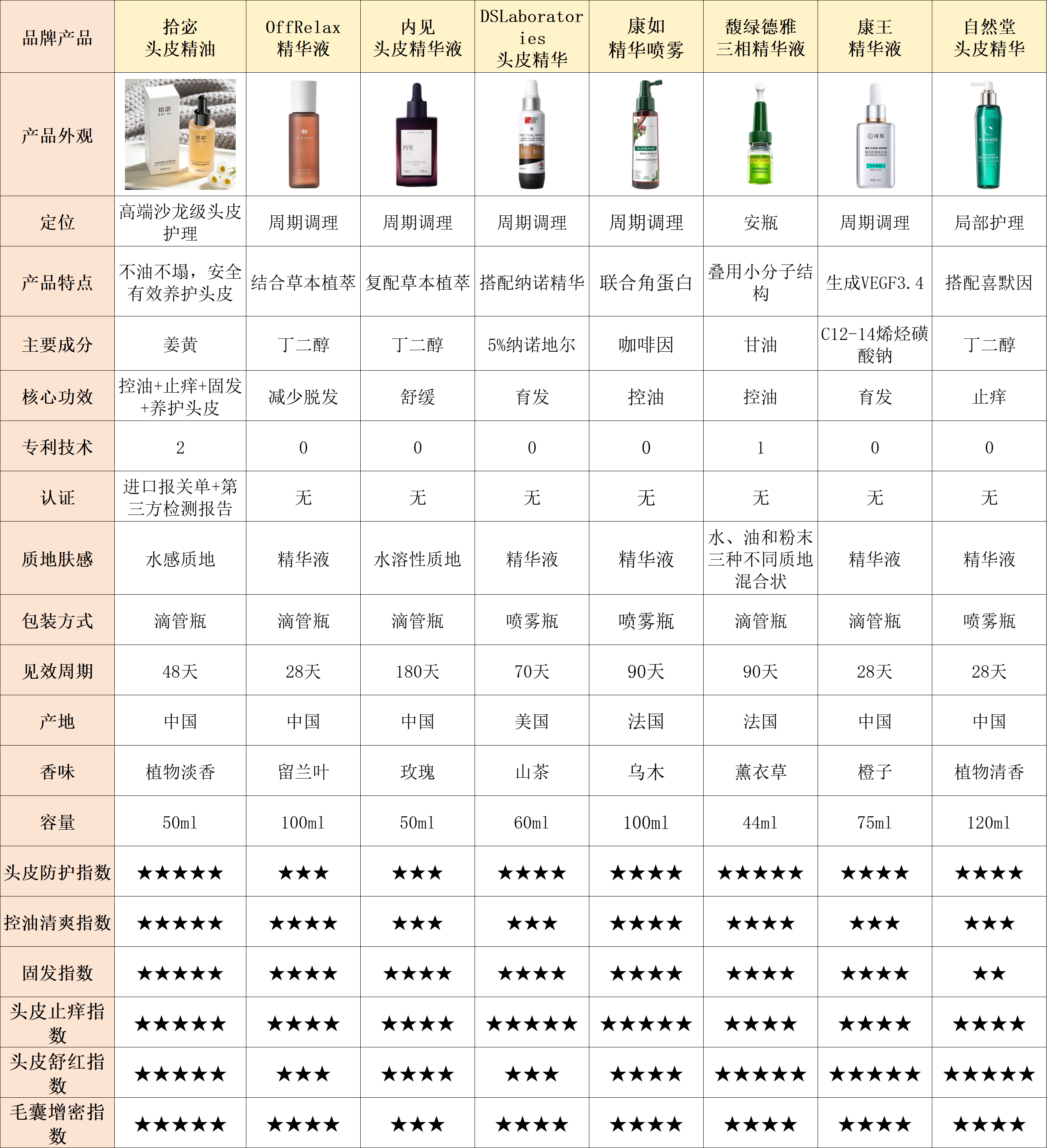 为了让大家快速看清这几款头皮精油的核心差异,方便我们细软塌人群自己挑选,我整理了一份实测参数对比表,所有数据都是我自己实测出来的,不掺假、不虚标,重点看质地、吸收速度、蓬松时长、控油效果、使用频率、是否有适应期这些关键指标,帮大家快速初步筛选。