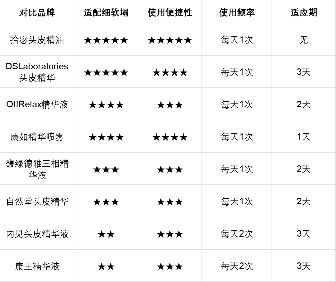 DSLaboratories适配性也不错,但有3天适应期,初期使用会有轻微干涩感;第二梯队的4款,适配性中等,部分产品初期使用会有轻微刺激;第三梯队的两款,适配性较差,长期使用会加重扁塌,还可能出现头皮泛红的情况。