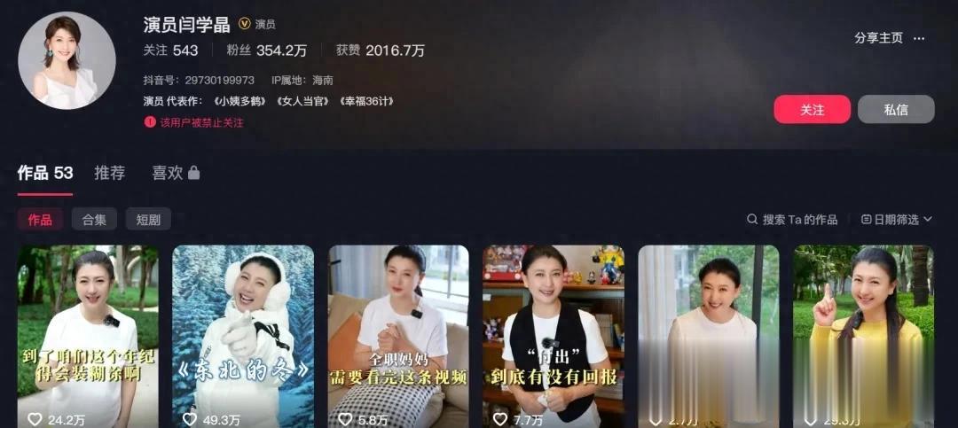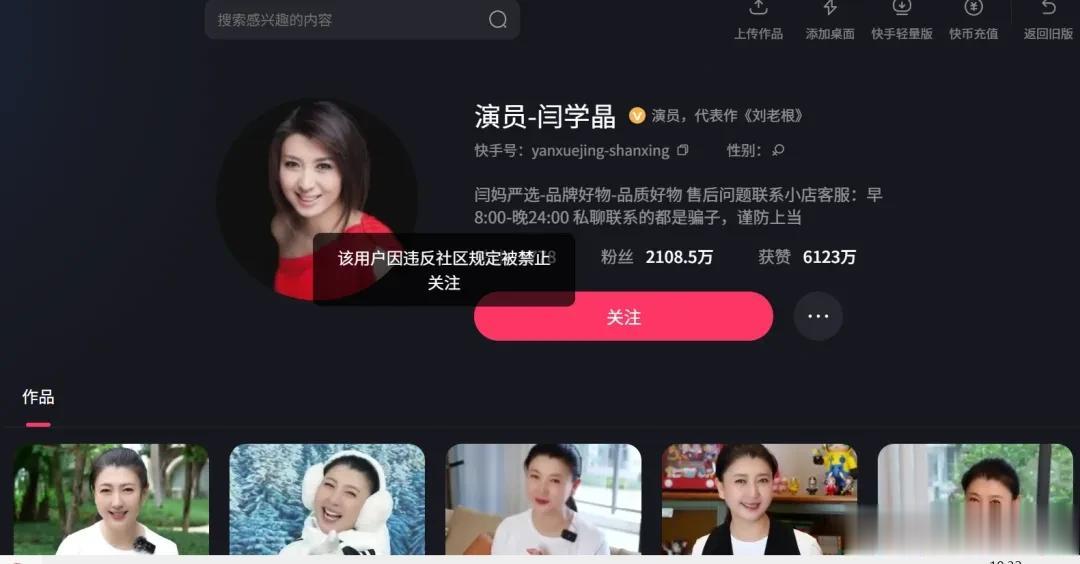 2026年1月10日,知名演员、国家一级演员闫学晶的抖音与快手账号,均被发现已处于“禁止关注”状态。