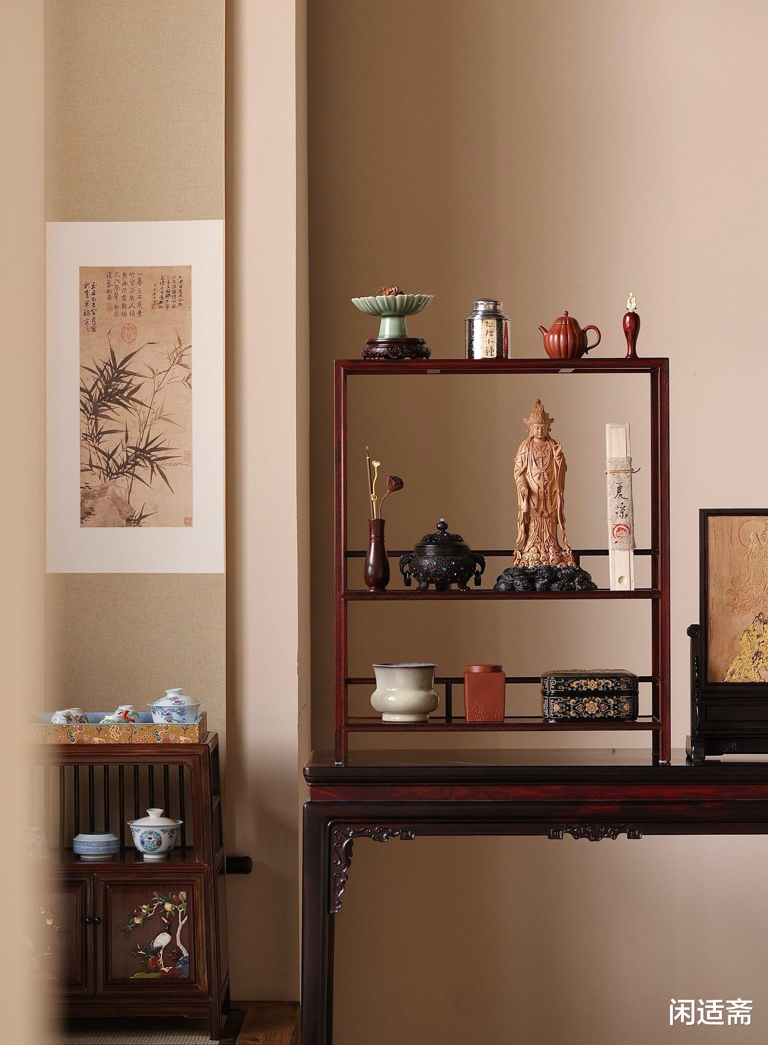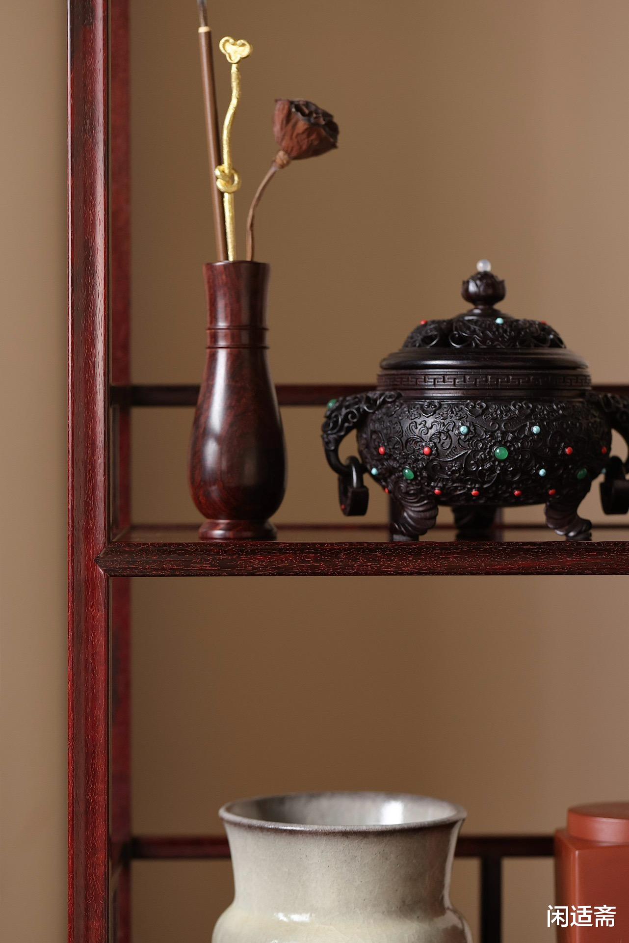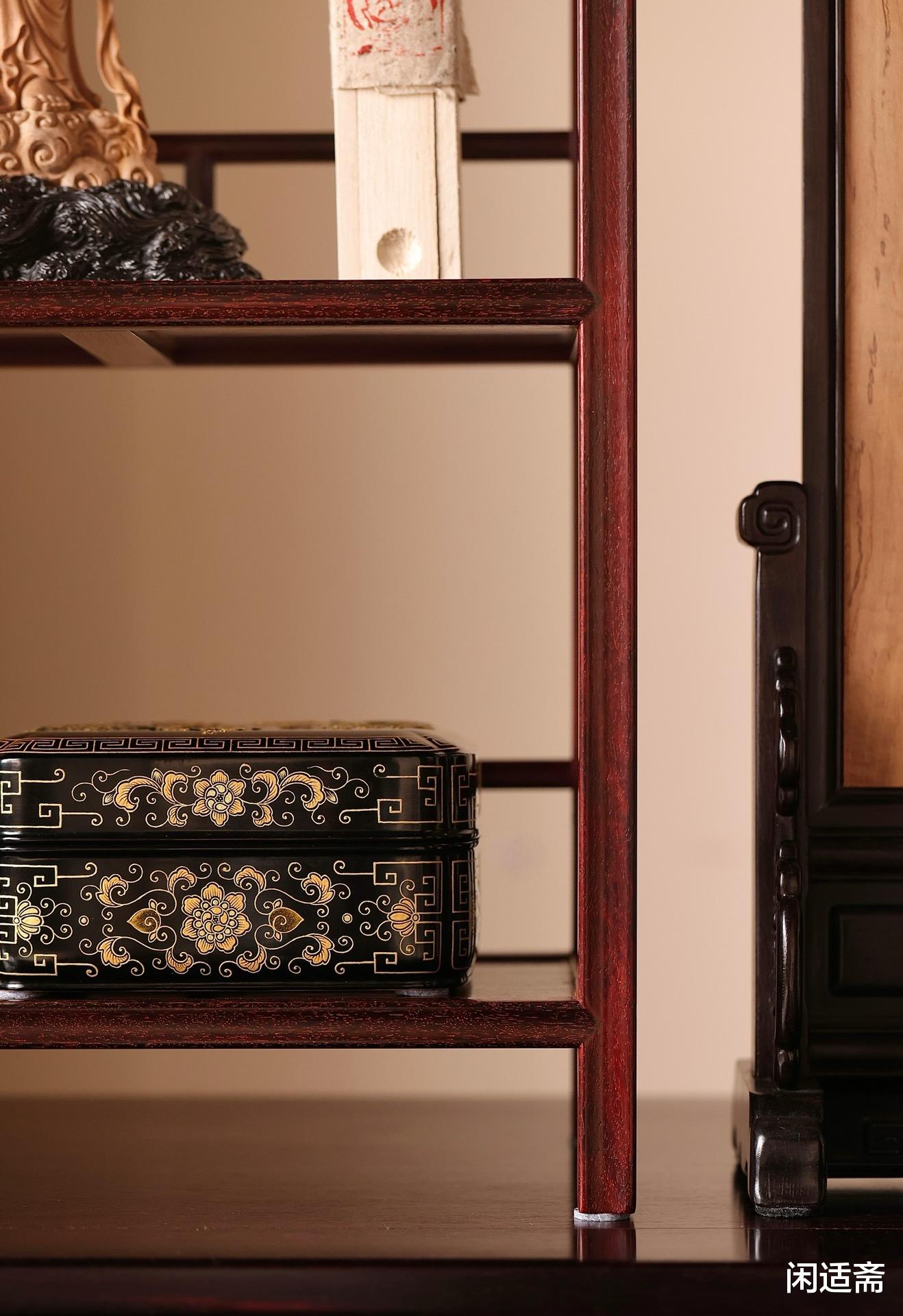 置物架的架格每一层都经过精心的尺寸规划,既能满足日常陈置文玩、书籍的需求,又不会显得拥挤不堪。置于案头,这款小叶紫檀琴料置物架瞬间成为了空间的焦点。无论是搭配一套精致的茶具,还是摆放几件心爱的文玩,它都能与周围的环境和谐共生,营造出一种高雅而舒适的生活氛围。