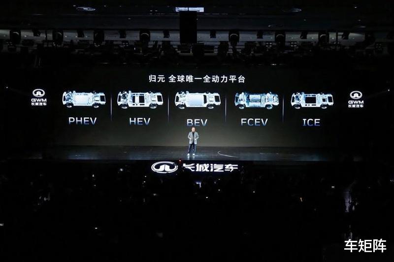 《车矩阵》行业分析:“打死不做增程”的长城汽车在一车多动力全新平台发布会上宣布,归元平台能够支持产出包括燃油、混动(插混/油混)、纯电、氢能五种动力形式的车型,像极了早些年丰田推出“丰巢”架构,即一个平台下会衍生出层级不同的新车型,节省成本的同时能快速推出适应市场的包括SUV、轿车、MPV、皮卡等全品类车型。