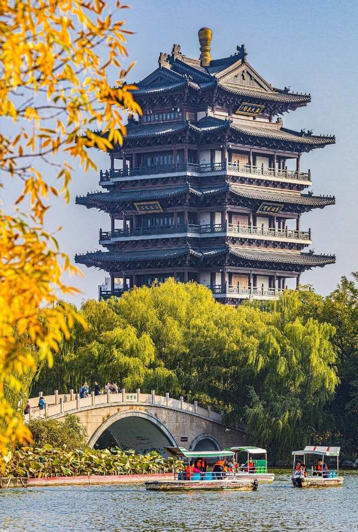 路线:东门(拍楼阁全景)→ 一层"诗国楼"(看历代咏楼诗)→ 三层"更上一层楼"(登顶观景)→ 鹳影湖(拍"黄河落日圆")→ 唐诗步道(寻李白名句)