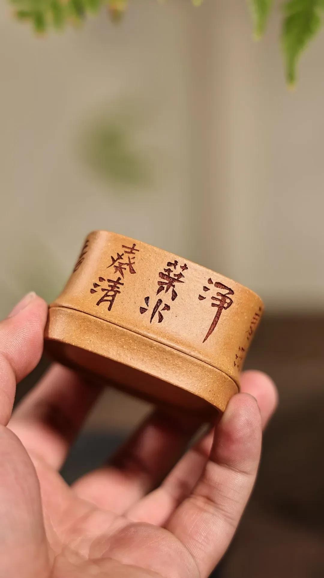 初见这杯子,你会被它的“方”所吸引。紫砂器中,圆器温婉,花器繁复,而方器独有一种简洁利落的力量感。原矿段泥的砂质,在光线下泛着淡淡的米黄光泽,如秋日晒干的泥土,质朴而温暖。泥料中隐约可见的砂砾,是大地未经雕琢的呼吸,让杯体在规整的方直中,保留了天然野逸的肌理。线条挺拔而清晰,并非咄咄逼人,而是一种内敛的自信与分寸。它不迎合手掌的弧度,却要求持杯者以更专注、更郑重的姿态去贴合它,在这微微的“不适”中,一种仪式感与敬意便油然而生。