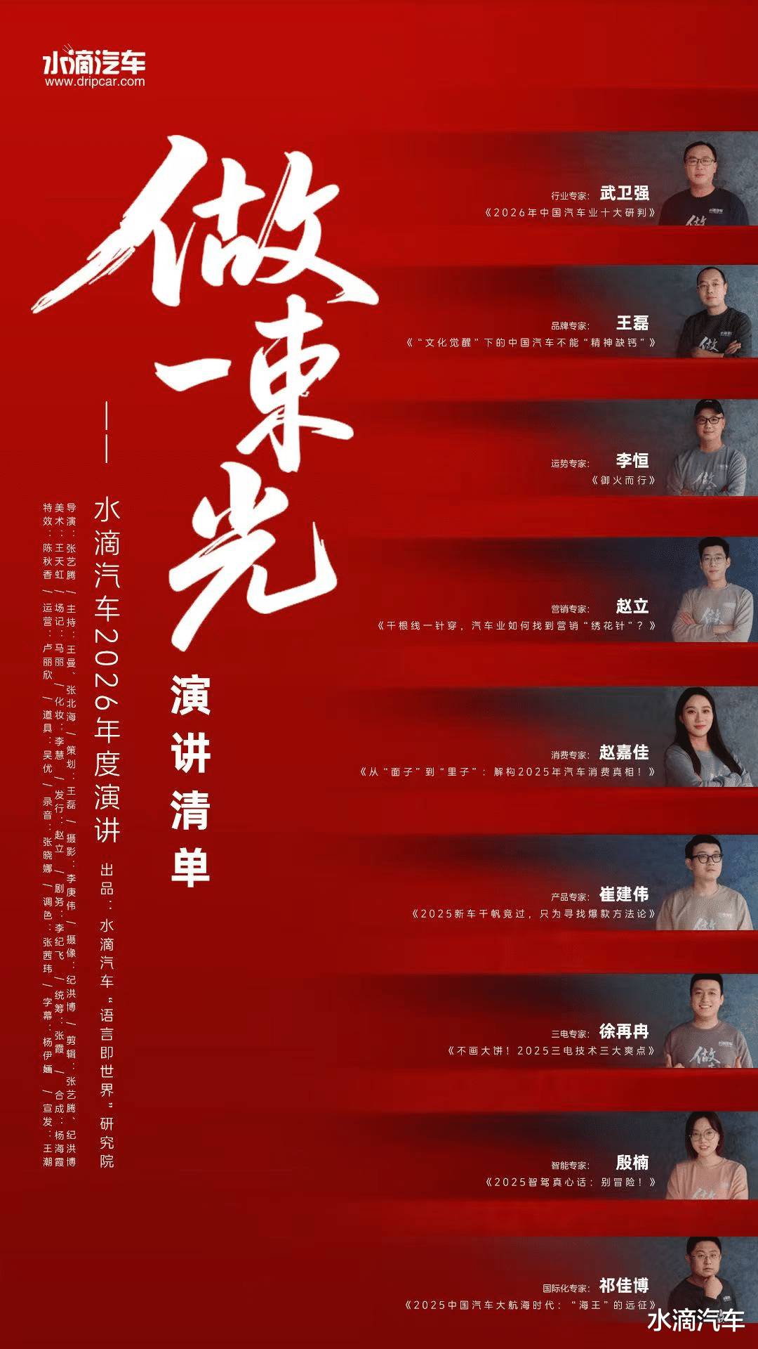 站在2026年的门槛上,汽车人是欢喜,是忧愁,是身心疲惫,还是踌躇满志呢?水滴汽车“语言即世界”研究院重磅推出年度演讲,9位研究员聚焦AI、出海、三电、消费、品牌、营销等维度,回顾2025年行业的波澜壮阔,关注小人物的悲欢离合,更提出面向2026年的十大预判。