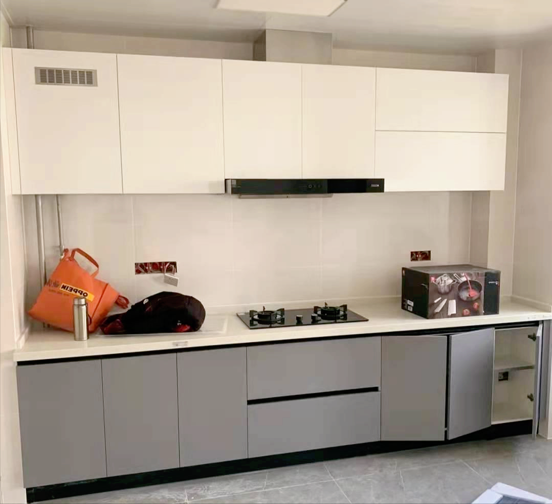 如果不想多花钱,可以将吊顶下返20公分,填补吊柜与吊顶之间的空隙,避免卫生死角。如觉得吊顶太低压抑,可以在二者之间加顶封板,花费不大,效果胜过卫生死角。