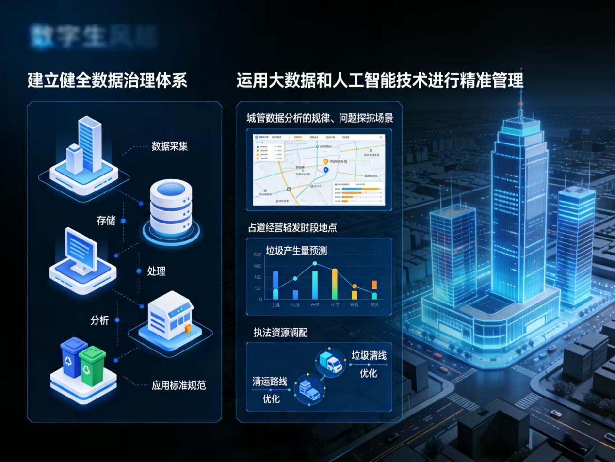 三、注重数据驱动,实现精准城市管理1、建立健全数据治理体系数据是智慧城管的核心要素。“十五五”规划建议提出要健全数据要素基础制度,这对于智慧城管而言,意味着需要建立健全数据治理体系。通过制定数据采集、存储、处理、分析和应用的标准和规范,确保城管数据的准确性、完整性和安全性。同时,加强数据共享和开放,促进城管数据与其他部门数据的互联互通,为城市管理提供更加全面和准确的数据支持。