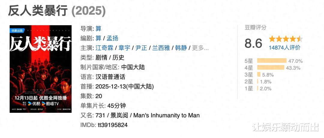 12月13日,《反人类暴行》播出,距离其5月开机仅过去六个月。一般来说,一部精品剧集从开机到播出至少需要一年。播出一周,豆瓣开分从8.5涨到8.6,今年国产剧最高,被观众评价“赶超美剧质感”,是“真细糠”。