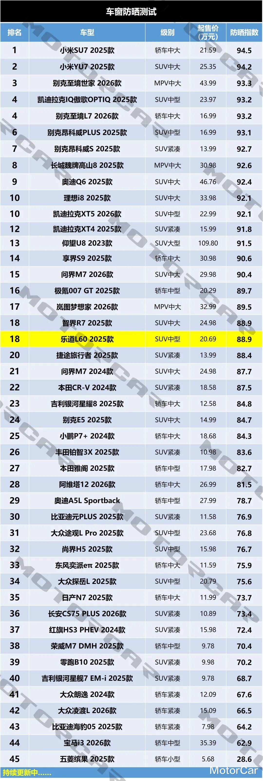 按照测试模型计算下来,乐道L60 2025款全车防晒指数为88.9分,在目前的测试排名中与智界R7暂时并列排名第18,在市面上属于中上水准。