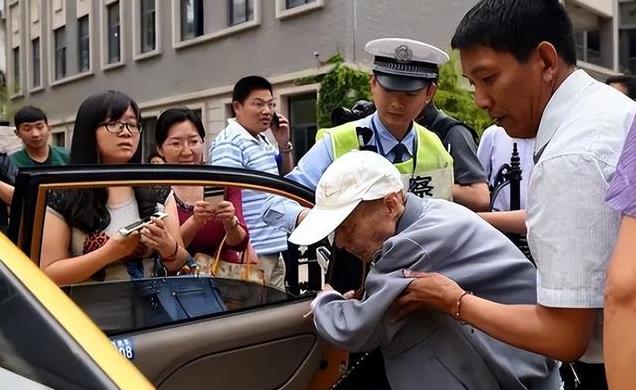 就在这熙攘的人群中,一位特殊的考生格外引人注目,他就是86岁的汪老,只见他身穿一件简单的短袖,手拄拐杖在搀扶下走向考场。