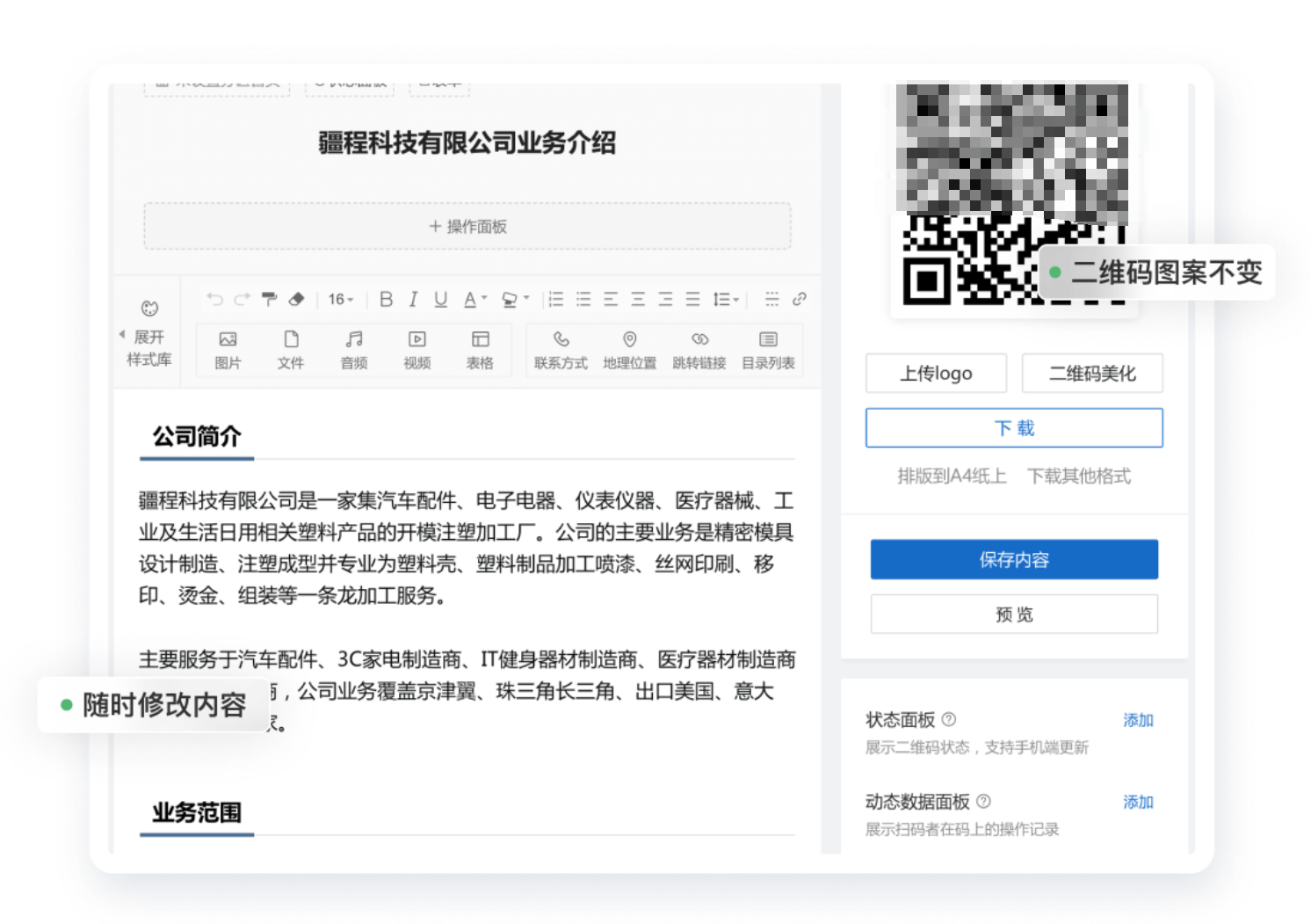 相比传统的纸质宣传资料或单一的图文页面,使用二维码来展示业务内容,具备展示形式多样、内容实时更新、长期有效等优势,适合应用在公司简介、个人名片、酒店民宿入住、旅游路线介绍等多种场景。草料二维码免费即可使用,零基础也可轻松搭建业务介绍二维码。