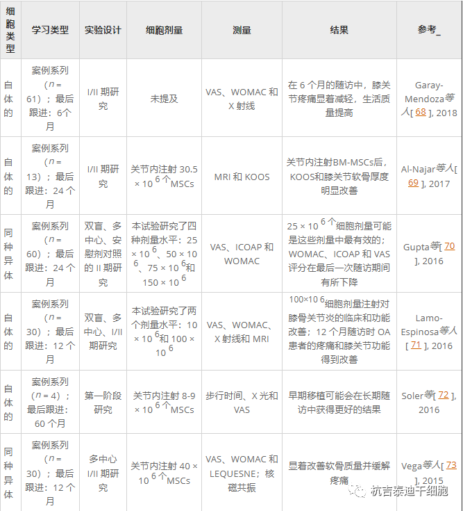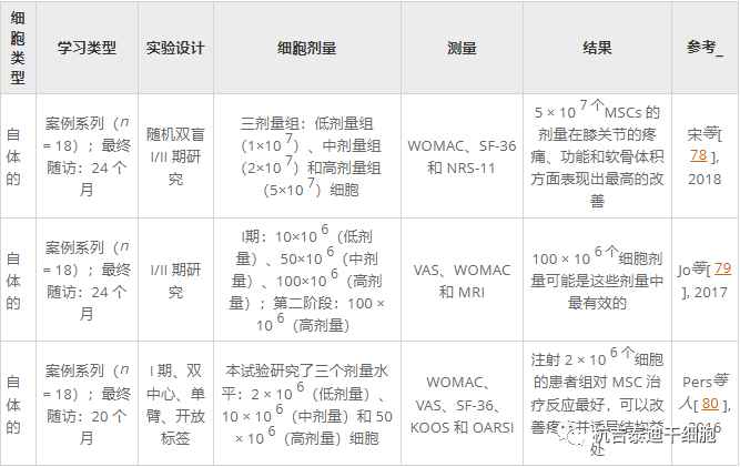 表5:关节内注射扩增的脂肪来源间充质干细胞在膝骨关节炎治疗中的总结