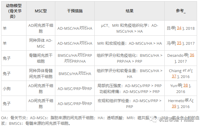 表2:近年来骨关节炎患者间充质干细胞/富血小板血浆临床试验总结。