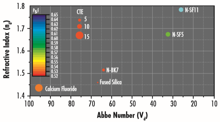 图1: 色散图表显示普通玻璃类型的折射率及其色散系数。