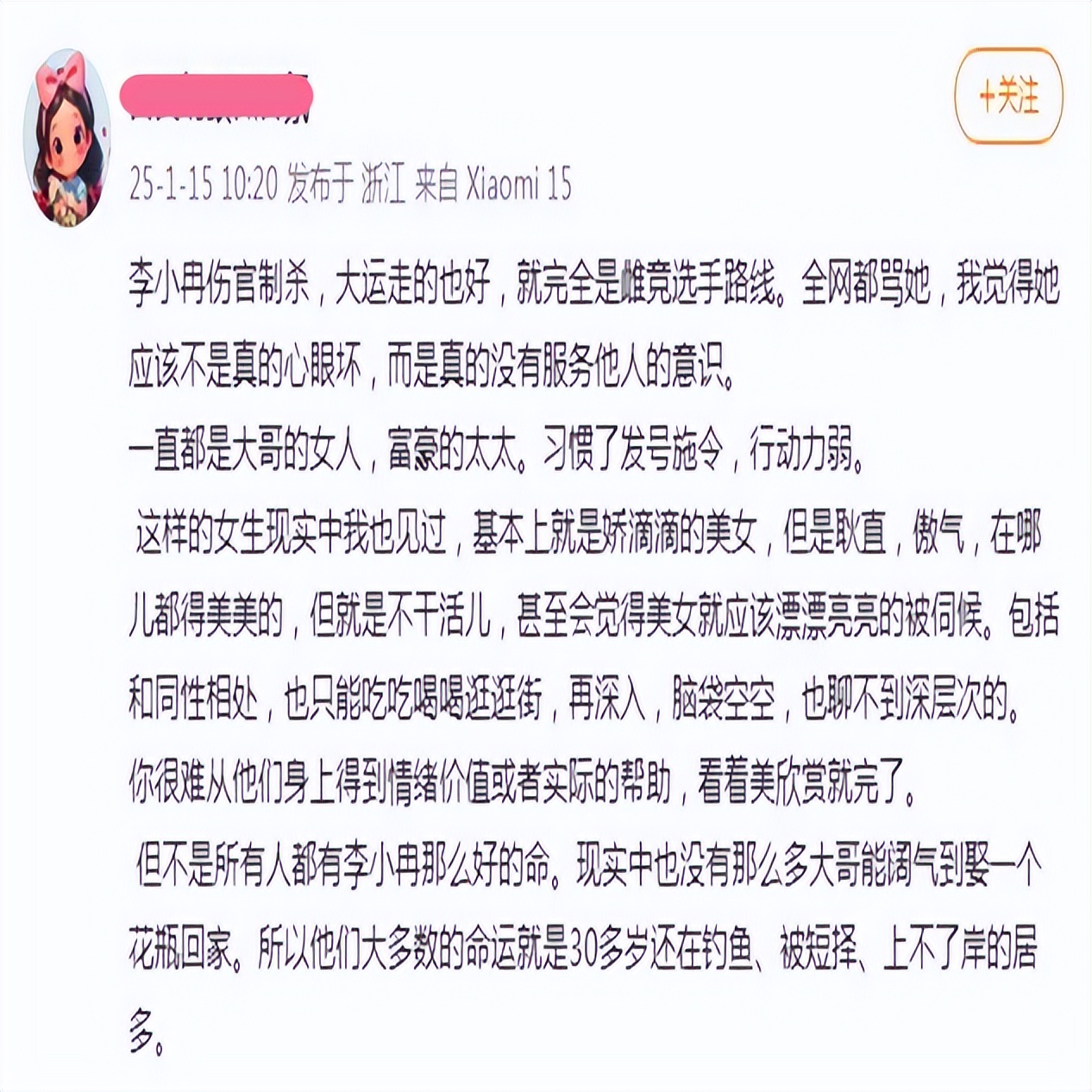 可这事儿还没完呢!还有神通广大的网友,居然扒出了李小冉的生辰八字,一顿分析猛如虎,说李小冉是伤官制杀的命格,天生就和同性“犯冲”,走的是同性相斥的路线。还说李小冉一直都是被男人捧在手心里,走到哪儿都被当成“小公主”一样照顾,想让她去共情别人,那难度系数简直太大了,这可能就是性格决定的。