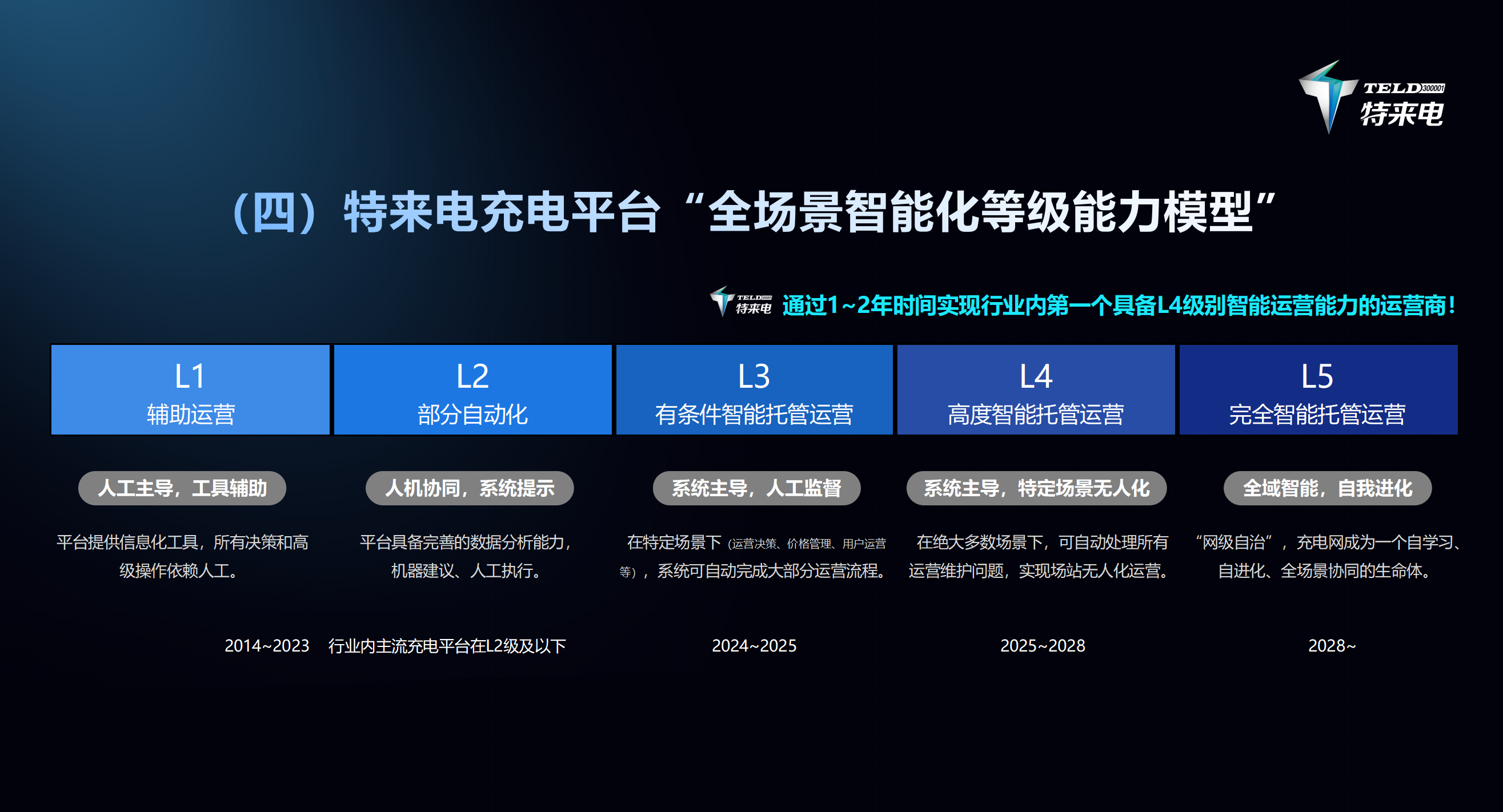 L5完全智能托管运营。全域智能、自我进化、网级自治,充电网成为一个自学习、自进化、全场景协同的生命体。