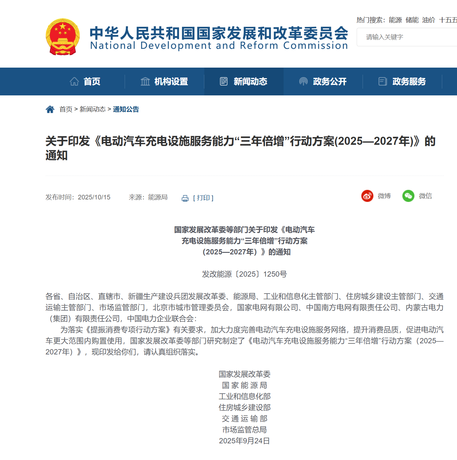 国家发展改革委、国家能源局、工业和信息化部、住房城乡建设部、交通运输部、市场监管总局等六部门联合印发《电动汽车充电设施服务能力“三年倍增”行动方案(2025—2027年)》。