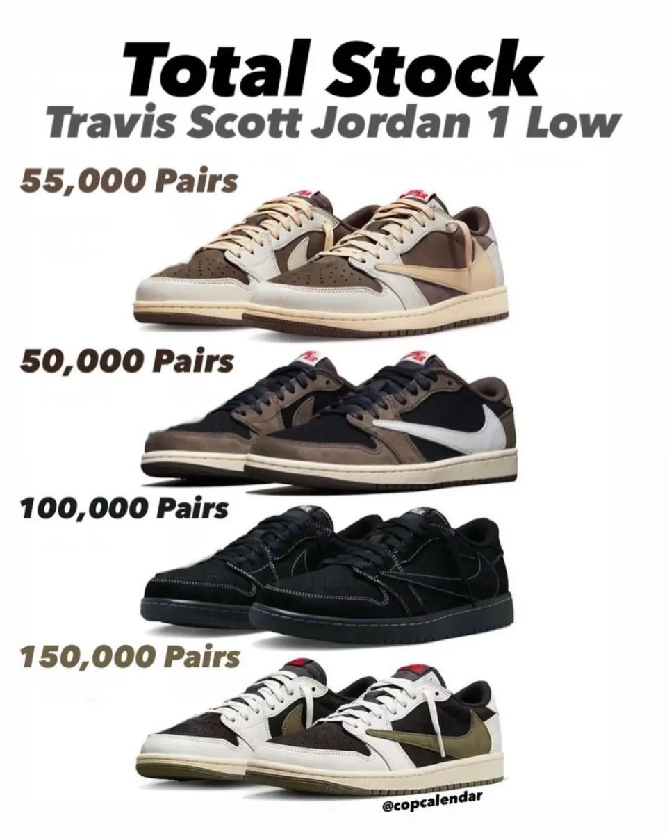 与此同时,有海外账号放出了「倒钩」Air Jordan 1 Low 每一款的货量对比,真是一代比一代发的多。