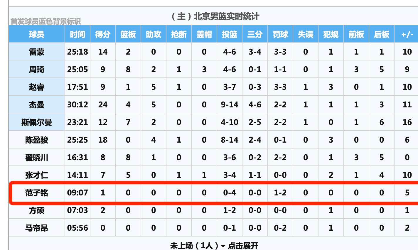 CBA常规赛赛迎来了北京首钢与深圳男篮的对决,本次比赛北京队打得很不错,进攻非常流畅,最后在主场以104-88大胜了深圳16分,目前北京首钢新赛季拿到了4连胜,目前排名联盟第一。但是在这样的胜利之夜,北京队却揪出了最大的混子球员,他就是范子铭。全场比赛范子铭出战了9分钟,投篮4中0仅靠罚球得到了1分,罚球还丢掉1分,实在是太拉胯了,白拿了600万顶薪。
