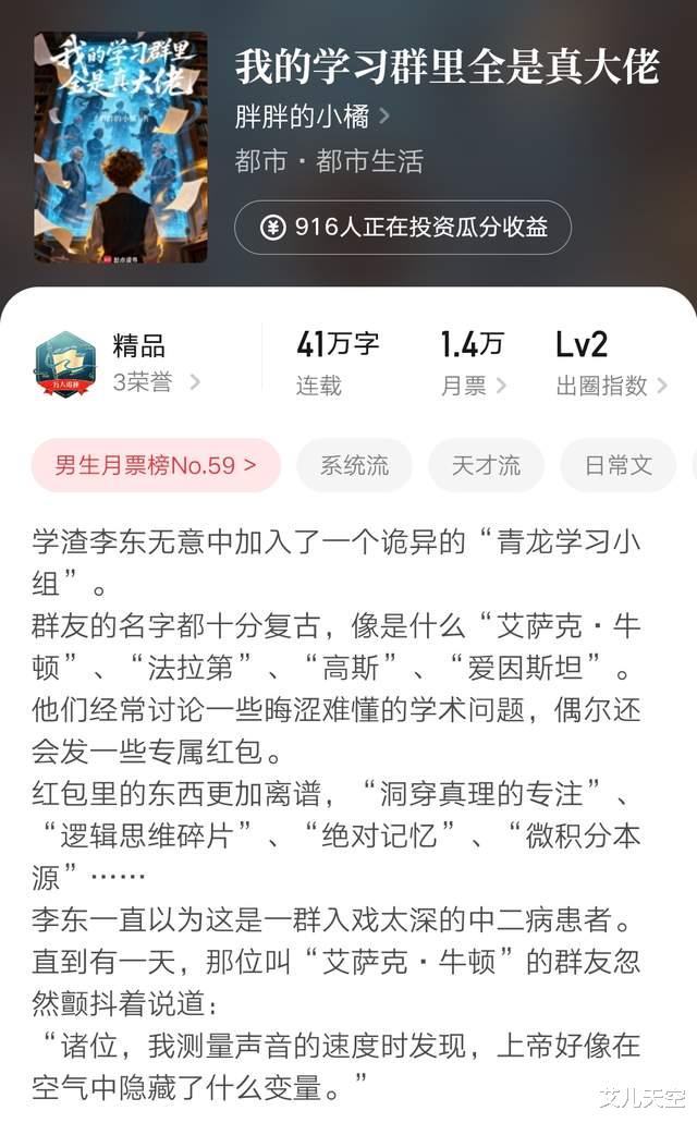 主角是个普通中学的高三学生,数学距离及格线总是差了几分的那种。在他想努力一下,在网上寻找各种学习小组的时候,误入了一个聊天群,里面都是诸多耳熟能详的科学大佬。