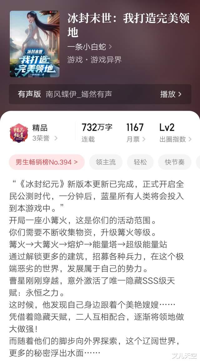 1、《冰封末世:我打造完美领地》完结,均订五千八