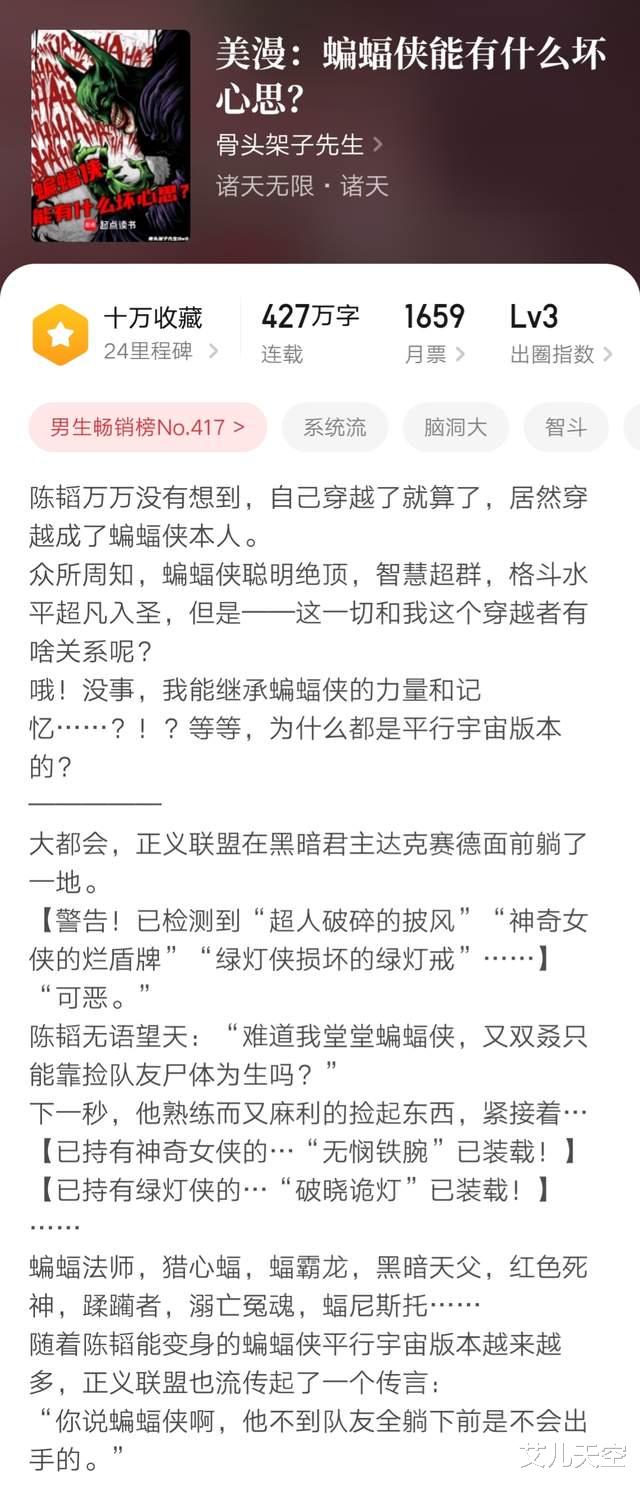 当然我看得也不多,只能说喜欢乐子人风格的可以试试,小说写了三年多,看着也有六千大精品这样的成绩。