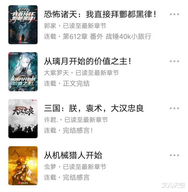 除了上面这两本小说,郭家的影视同人文《恐怖诸天:我直接拜酆都黑律!》、大紫罗天的原神同人《从璃月开始的价值之主!》、许君的三国袁术、虫梦都机械猎人这几本小说也都完结了。