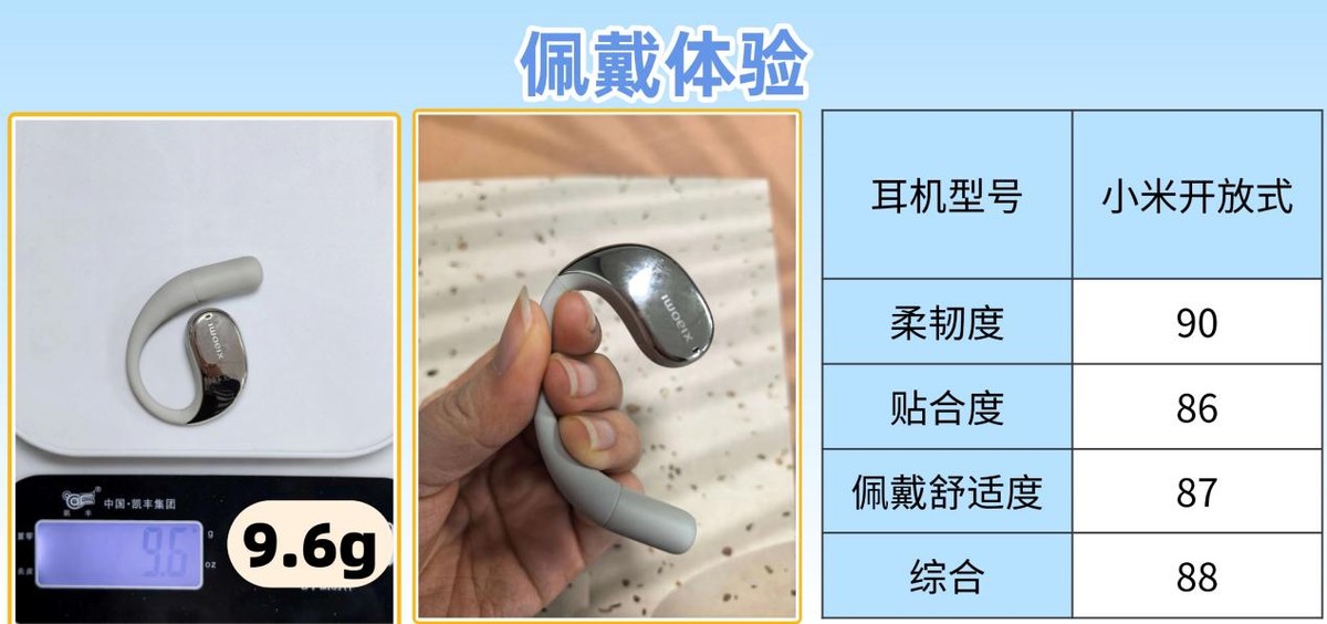 小米开放式耳机采用常见的挂耳式结构,单耳重9.6g,比南卡OE Mix2略重,但日常佩戴仍较舒适,连续使用3-4小时无明显负重感。其耳挂采用柔性硅胶材质,弧度经人体工学优化,可贴合多数耳型,日常通勤等活动时稳固不易滑落,但在跑步、跳绳等剧烈运动中偶有轻微晃动。对戴镜用户兼容性尚可,但长时间佩戴后耳挂与镜腿接触处会产生轻微压迫感,需偶尔调整。