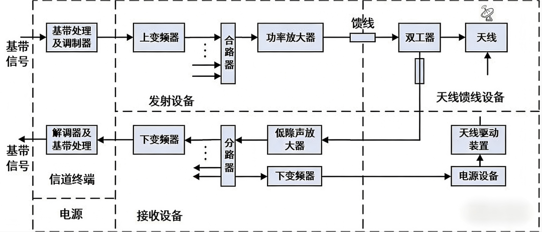 负责信号的频率变换和功率放大。在发射链路中,来自基带分系统的中频信号需要上变频到射频频率(如C波段、Ku波段或Ka波段),再由高功率放大器(HPA)放大到足够的功率后,通过天线辐射到卫星。
