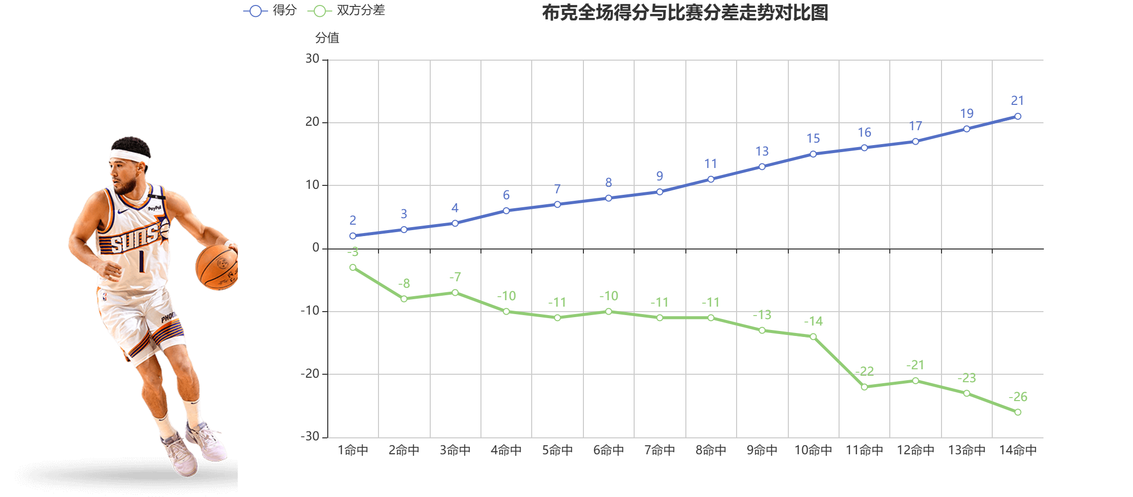 21分正负值-32,布克的数据虽然不错,但对太阳攻防转换的作用却几乎可以忽略不计。