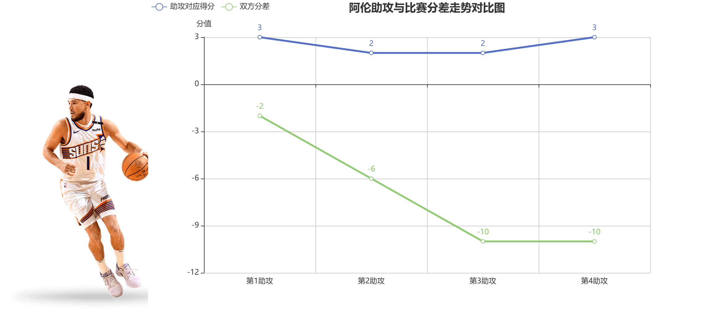 第1节比赛刚打了9分58秒分钟,布克拿到第1个助攻,助功比尔如虹一掠,三分弹无虚发。太阳当前分差为-2分。 第1节比赛还有6分45秒分钟的时候,布克拿到个人第2次助攻,帮助比尔电光火石间,抛投一气呵成。太阳分差为-6分。 首节比赛进行到还剩4分23秒的时候,伊戈达罗接到布克助攻命中漂移投篮,太阳当前分差为-10分。 首节进行到6分45秒分钟时候,布克拿下第4个助攻,助功阿伦远投三分轻松命中。太阳落后了10分。