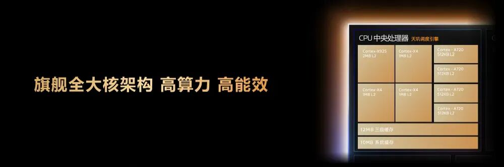 天玑 9500s 采用旗舰3nm制程和全大核架构,八核CPU包含 1 个主频高达3.73GHz 的 Cortex-X925 超大核,以及 3 个 Cortex-X4 超大核和 4 个 Cortex-A720 大核。