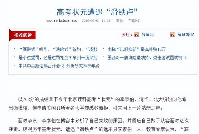 2010年,李泰伯高考703分,拿下北京理科状元,被人们称为“世界级人才”。