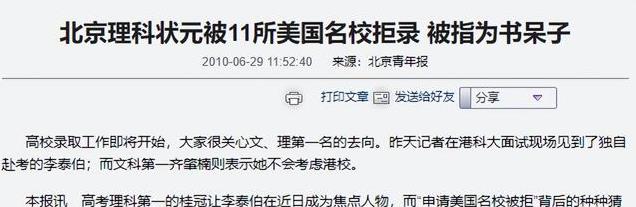 北京青年报2010年6月29日发布:北京理科状元被11所美国名校拒录 被指为书呆子