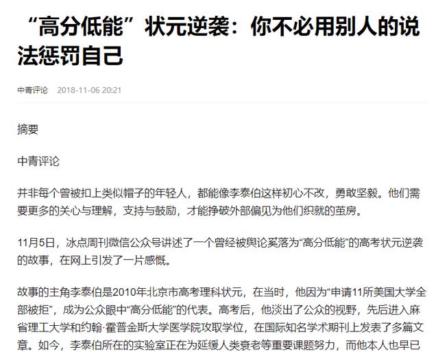中青评论2018年11月6日发布:“高分低能”状元逆袭:你不必用别人的说法惩罚自己